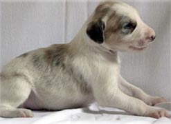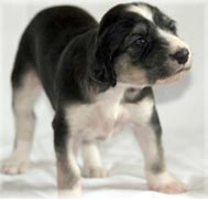Der Vater dieses gescheckten leberbraunen Welpen (Abb. 3.1.16) ist der oben gezeigte Sabuk (Abb. 3.1.2-22. Er ist dunkel Leberbraun (anthrazit-chocolate), die Mutter ist cremefarben (Vater: Schwarzschecke, Mutter: leberfarben). Einfach besetzte leberbraunfarbene Hunde, also Bb, können sowohl Schwarz als auch Leberfarbe vererben.