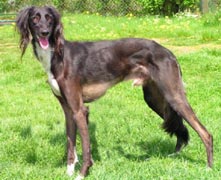 Schwarz kann, wie gesagt, durch den rezessiven Faktor b in Leberbraun (,Chocolate') gebleicht werden. Die Salukis können vom dunklen, fast schwarzen Schokoladebraun bis zum Milchkaffeebraun erscheinen. Bb bewirkt Leberbraun mit brauner Nase, bb Braun mit heller Nase und hellen Augen. Es kann auch ein Goldton mit hellen grünlichen Augen entstehen, der bei den Züchtern nicht beliebt ist. Diese Farbe Leberbraun ist in letzter Zeit in Deutschland kaum aufgetreten.